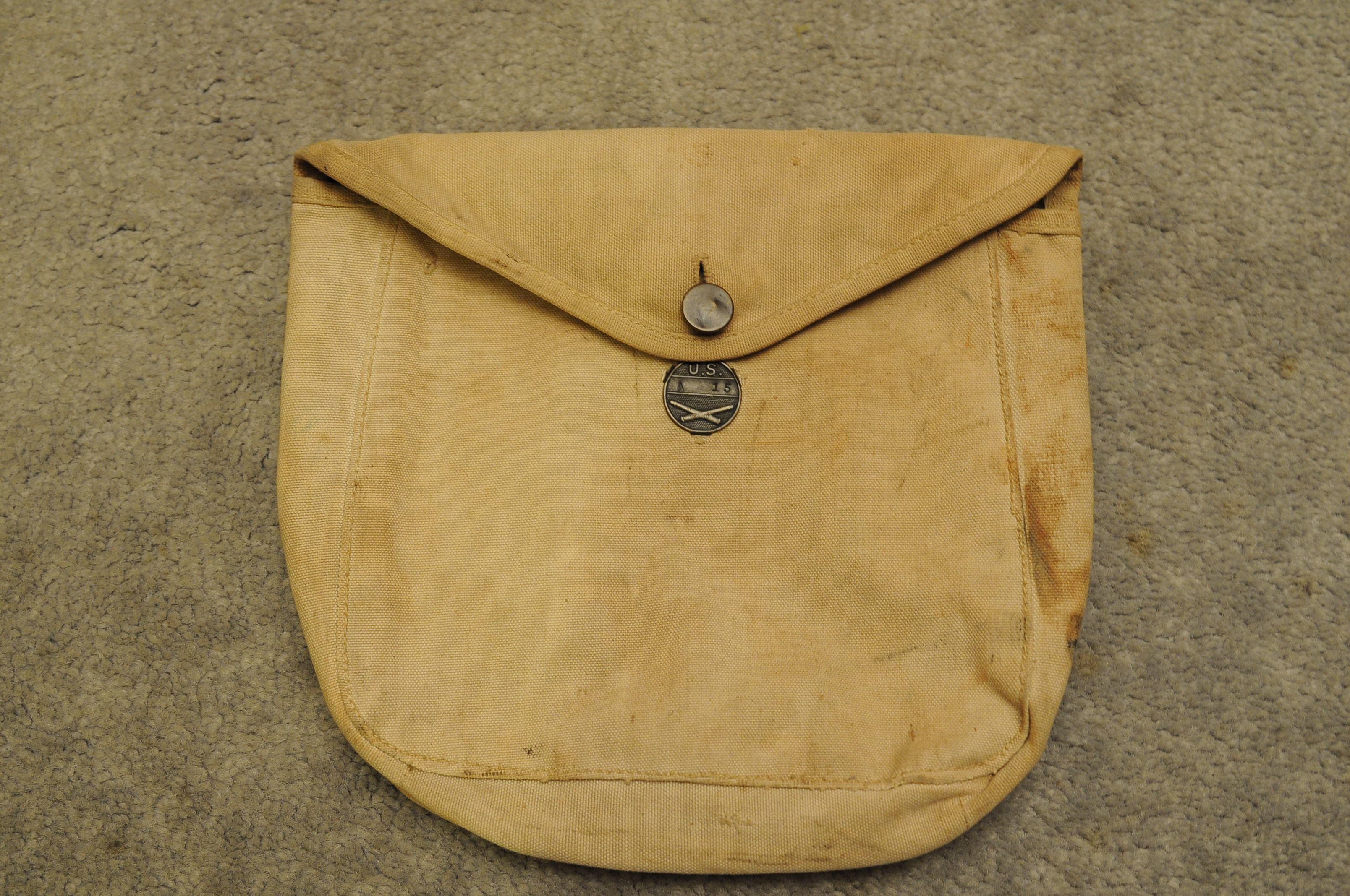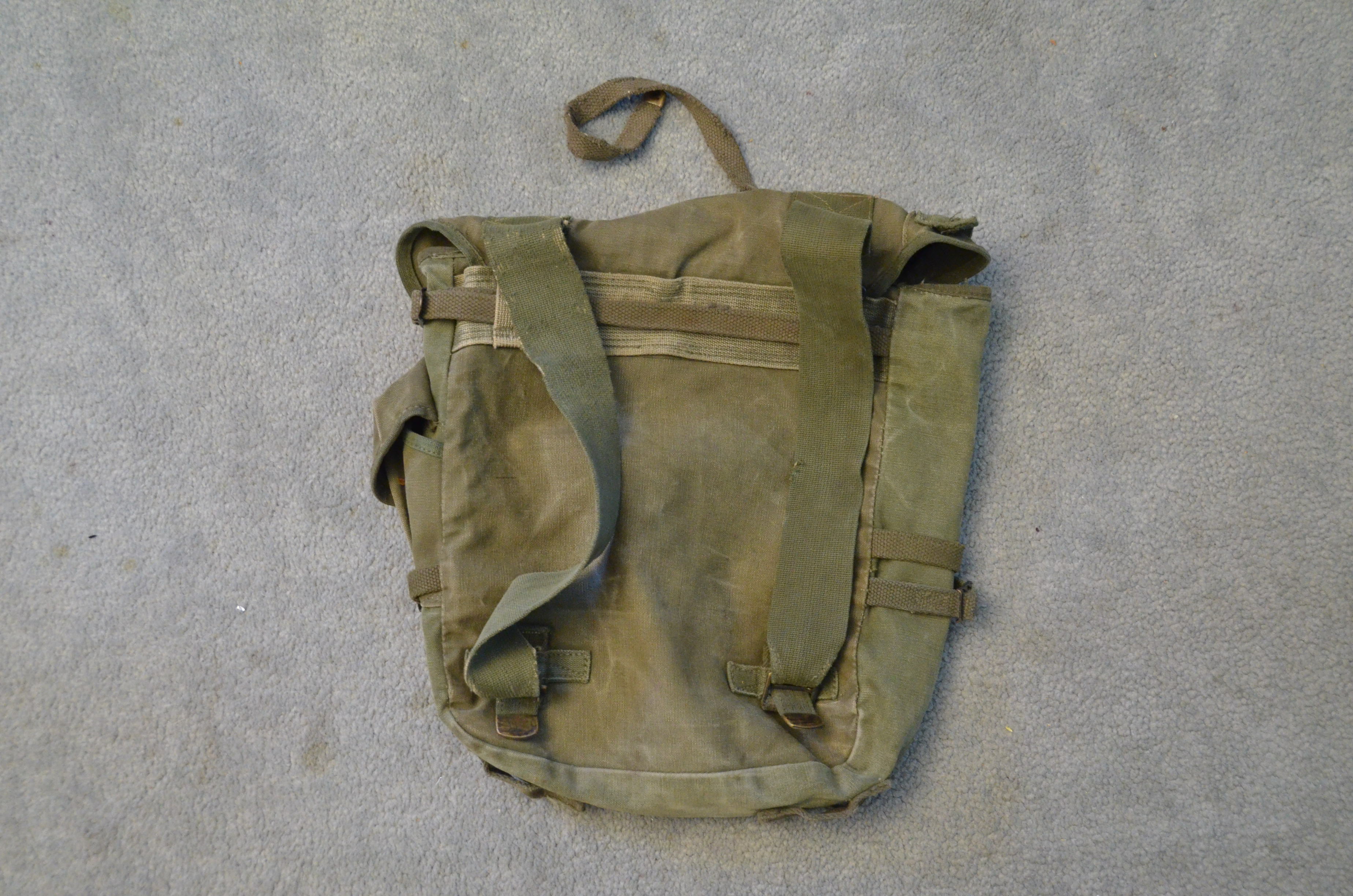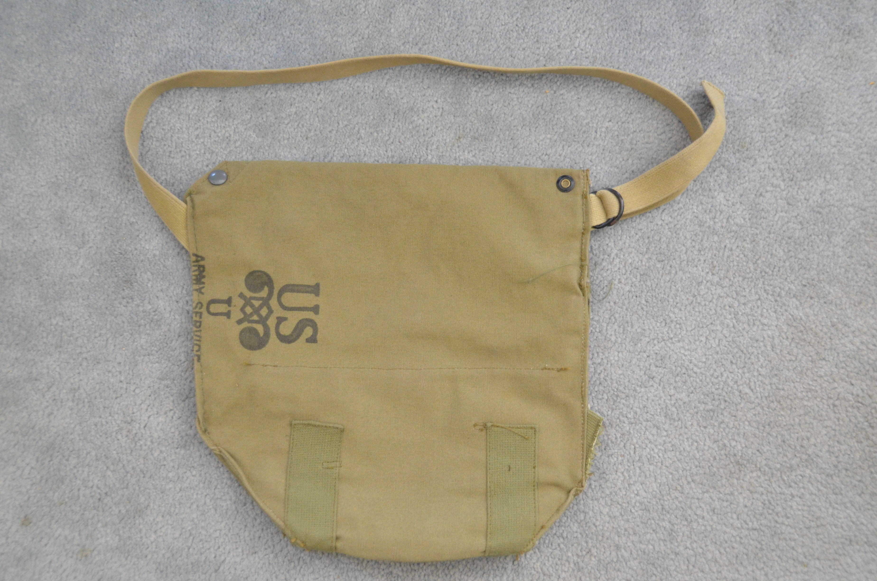SOLD - WW2 M-6 gasmask bag #1, stain on front and missing strap, otherwise solid cond.