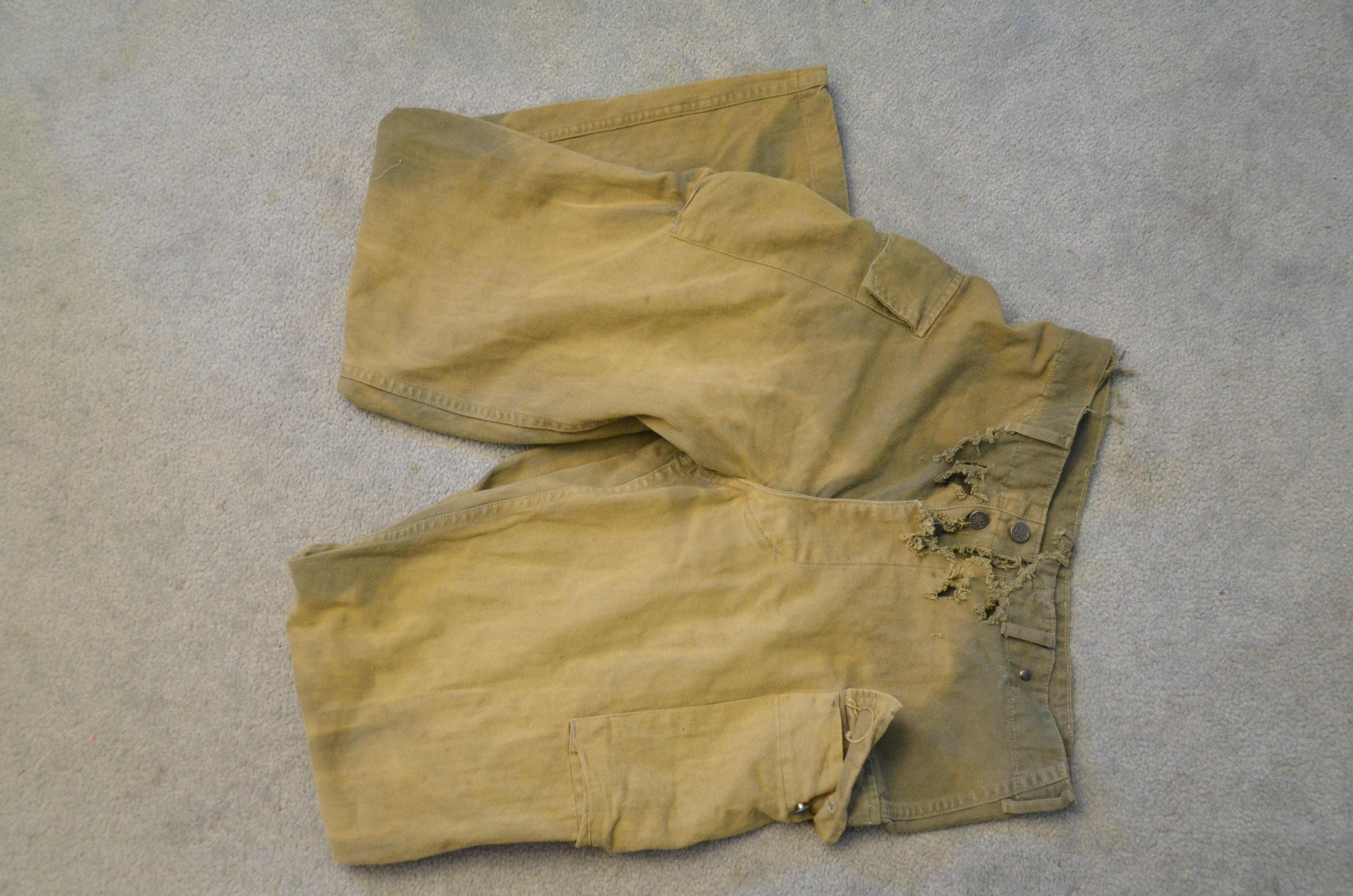 SOLD - WW2 repro HBT trousers #3, used in Saving Private Ryan, blown off leg, lots of blood